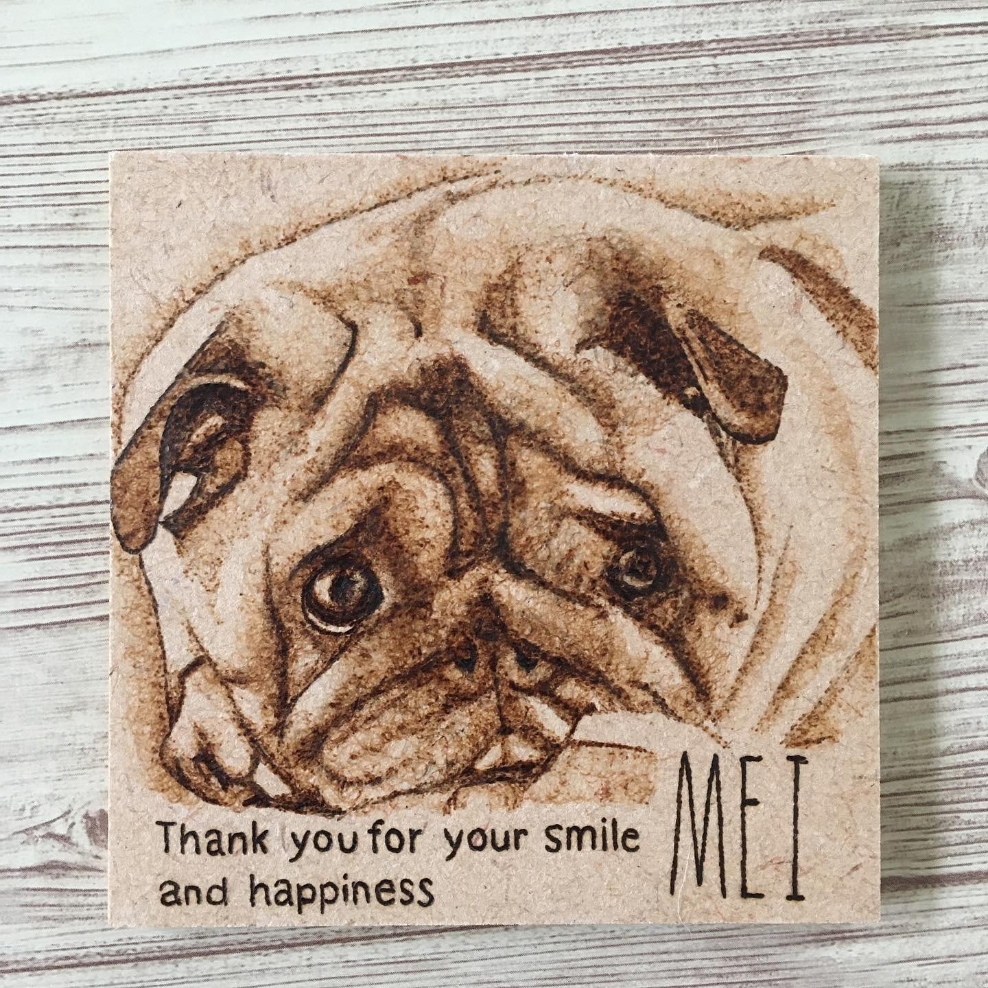ウッドバーニングという焼き付けて絵を描く手法で、暖かみのある木材に、わんちゃんや猫ちゃんの、世界に1つだけのオーダーメイド品をお作りいたします( ¨̮ )
